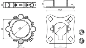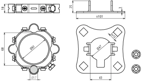 Befæstigelsessæt til montering af HVI light-lederen på støtterør Ø50 mm (f.eks. HVI long-støtterør). Består af tilslutningsplade (til fire ledere, inklusive to fortandede låsemøtrikker) og befæstigelsesring med fire udskårne lederholdere (Ø17 mm) til tilpasningsområdet (inkl. to kabelbindere).