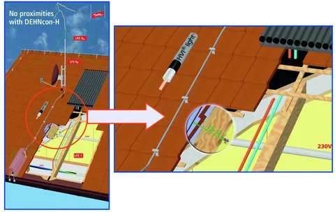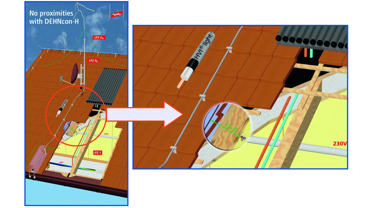 – Højspændingsresistent isoleret nedleder til overholdelse af separationsafstanden til elektrisk ledende dele iht. DIN EN 62305-3 (VDE 0185-305-3).