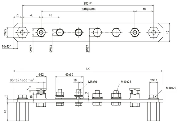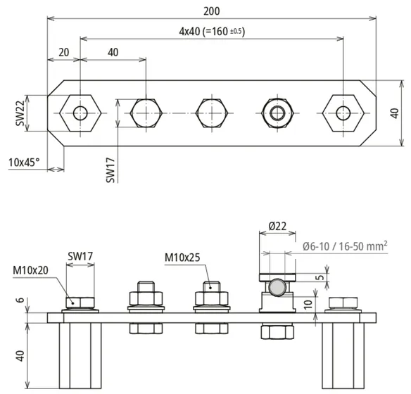 | Tilslutninger | 1x KS-forbinder, 2x skruetilslutning M10 |