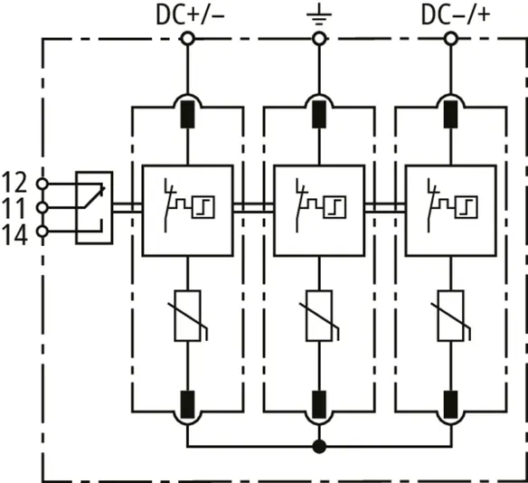 | Mærkeafledestødstrøm (8/20 µs) [(DC+/DC-) --> PE] (In ) | 15 kA |