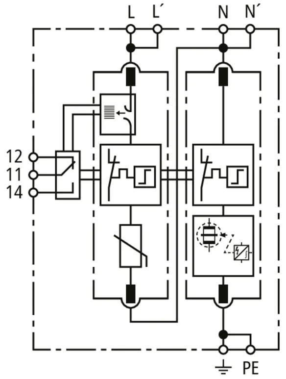Modulær overspændingsafleder med Advanced-Circuit Interruption (ACI) til TT- og TN-S-systemer (3+1-kobling), med potentialfri fjernmeldekontakt.