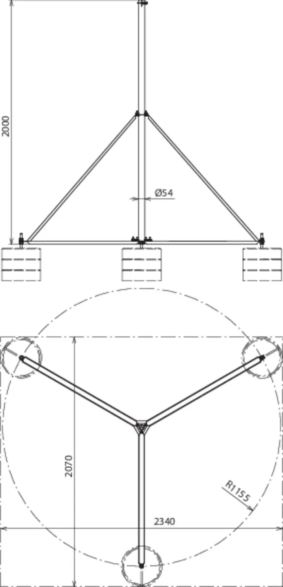 Til opstilling med betonsokler (vægt 17 kg). Tilpasning til taghældningen op til maks. 10° ved hjælp af variabel fastgørelse til bundbeslaget. Indfangerstang D40 / støtterør eller stabelbar betonsokkel (art.-nr. 102 010) skal bestilles separat.