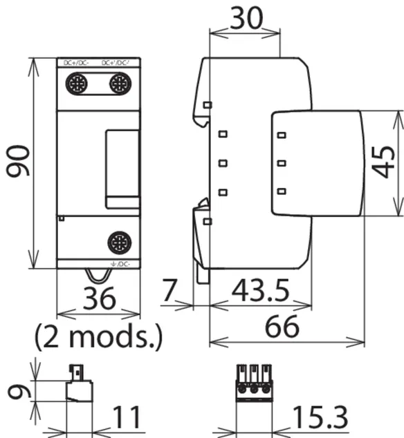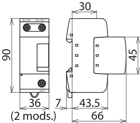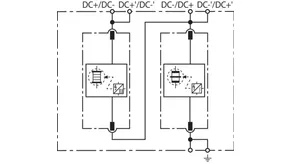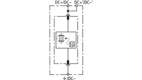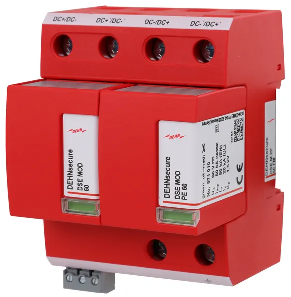 2-polet, koordinerbar og modulær lynstrømsafleder til DC-anlæg op til 60 V ("1+1"-kobling); FM-udgave med fjernmeldekontakt til fjernovervågning (potentialfri skiftekontakt)