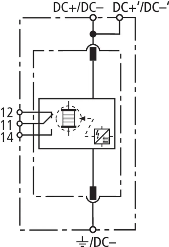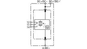 1-polet, koordinerbar og modulær lynstrømsafleder til DC-anlæg; med fjernmeldekontakt til fjernovervågning (potentialfri skiftekontakt).