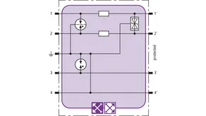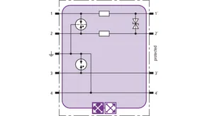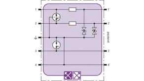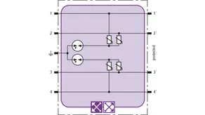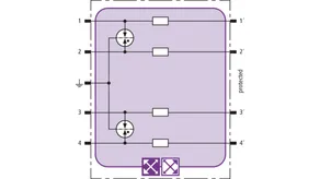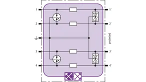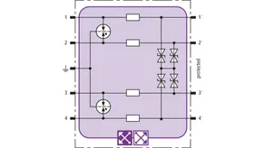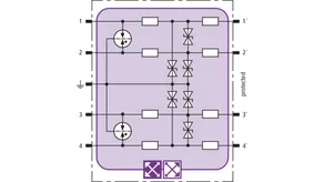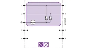 Pladsbesparende kombiafledermodul med RFID-LifeCheck-funktion til beskyttelse af to lederpar i 24 V DC-anlæg. Kan også bruges i systemer med jordede minuspoler. Integrerede PTC-modstandere tillader pålidelig genstart af aflederen efter kortslutningsstrøm op til 40 A i et anlæg.
