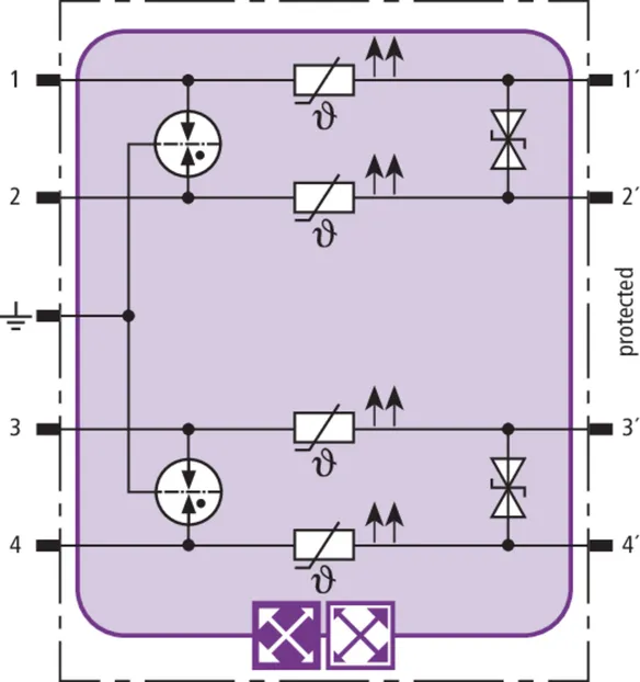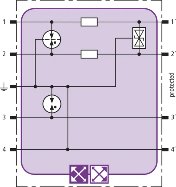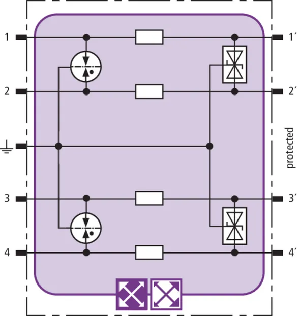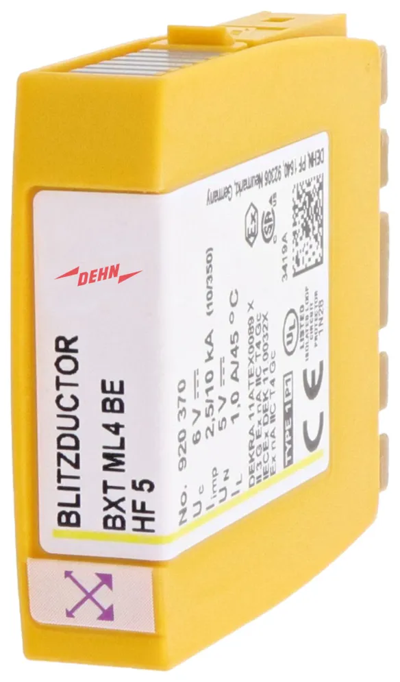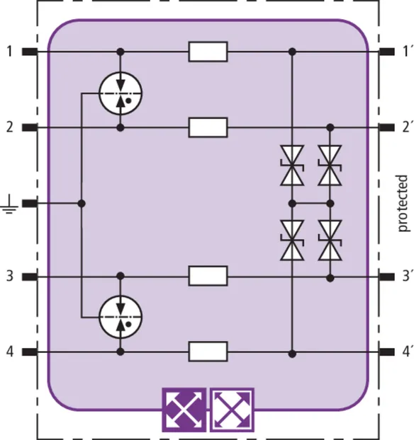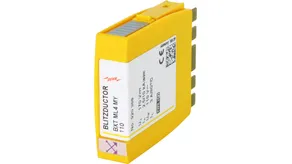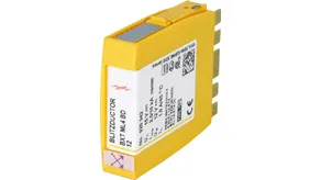 Pladsbesparende, 4-polet kombiafledermodul med RFID-LifeCheck-funktion til beskyttelse af fire enkeltledere med fælles referencepotentiale i ubalancerede snitflader. LifeCheck registrerer termisk eller elektrisk overbelastning, hvorefter modulet skal udskiftes. Denne tilstand indikeres berøringsløst af DEHNrecord LC / SCM / MCM-læseren.