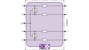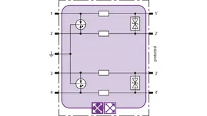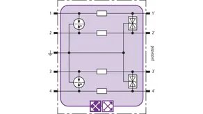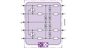 Pladsbesparende kombiafledermodul med RFID-LifeCheck-funktion til beskyttelse af fire enkeltledere med fælles referencepotentiale i højfrekvente signalsystemer uden galvanisk adskillelse. LifeCheck registrerer termisk eller elektrisk overbelastning, hvorefter modulet skal udskiftes. Denne tilstand indikeres berøringsløst af DEHNrecord LC / SCM / MCM-læseren.