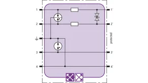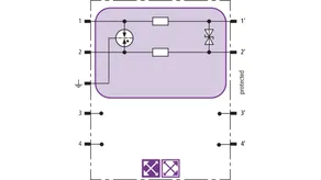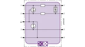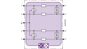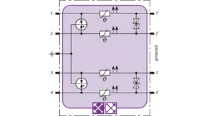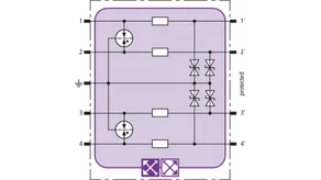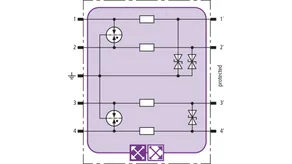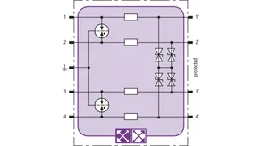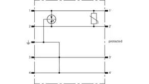 Pladsbesparende kombiafledermodul med RFID-LifeCheck-funktion til beskyttelse af to lederpar i 24 V DC-anlæg. Kan også bruges i systemer med jordede minuspoler. Integrerede PTC-modstandere tillader pålidelig genstart af aflederen efter kortslutningsstrøm op til 40 A i et anlæg.