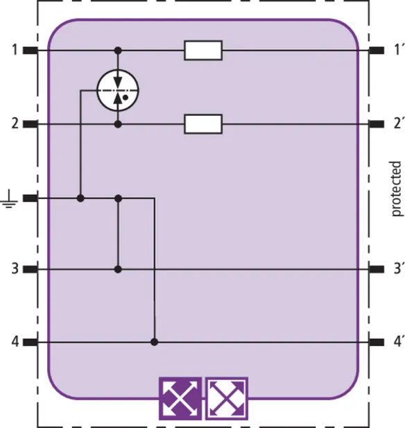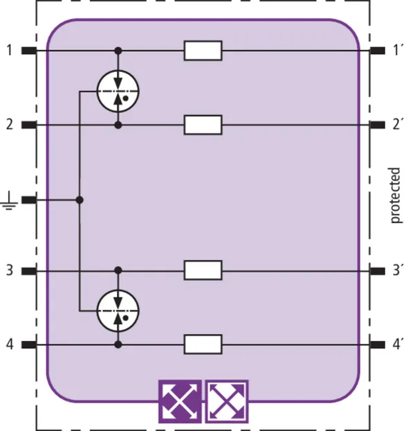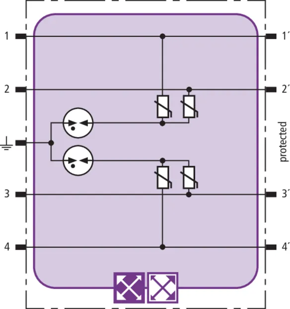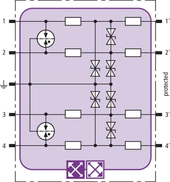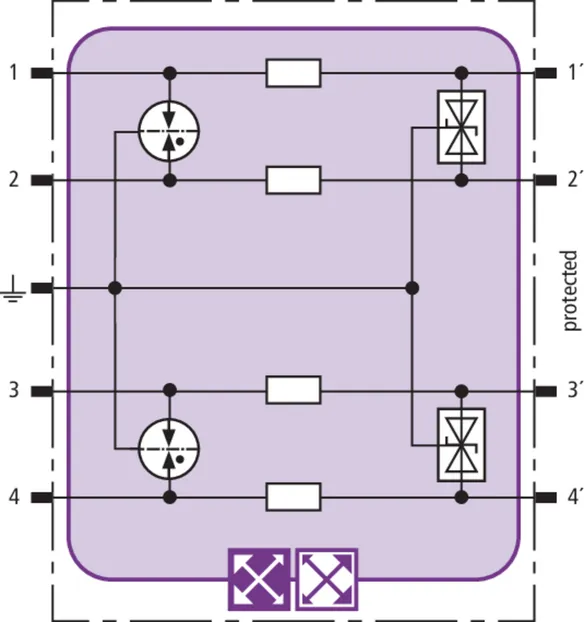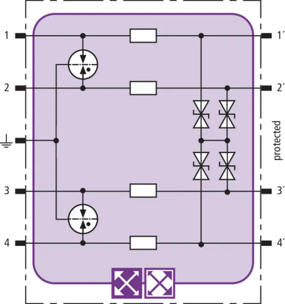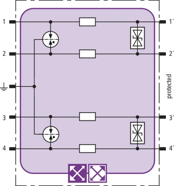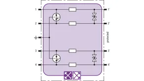 Pladsbesparende, 4-polet kombiafledermodul med RFID-LifeCheck-funktion til beskyttelse af fire enkeltledere med fælles referencepotentiale i ubalancerede snitflader. LifeCheck registrerer termisk eller elektrisk overbelastning, hvorefter modulet skal udskiftes. Denne tilstand indikeres berøringsløst af DEHNrecord LC / SCM / MCM-læseren.
