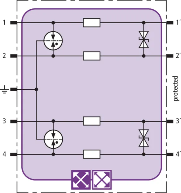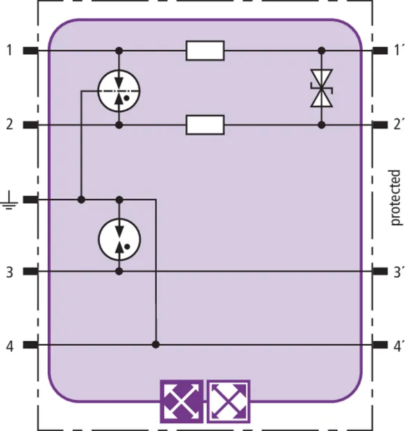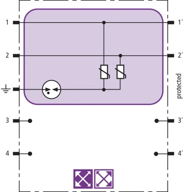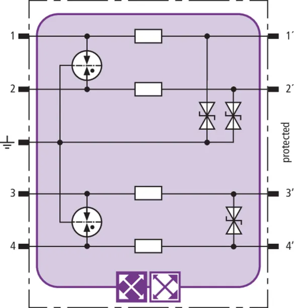 Pladsbesparende beskyttelsesmodul med RFID-LifeCheck til beskyttelse af 1 lederpar i ikke-jordede, symmetriske grænseflader, enten direkte eller indirekte skærmjording. LifeCheck registrerer termiske eller elektriske overbelastningstilstande, hvor aflederen skal udskiftes. Visningen sker berøringsfrit ved hjælp af DEHNrecord LC/SCM/MCM.