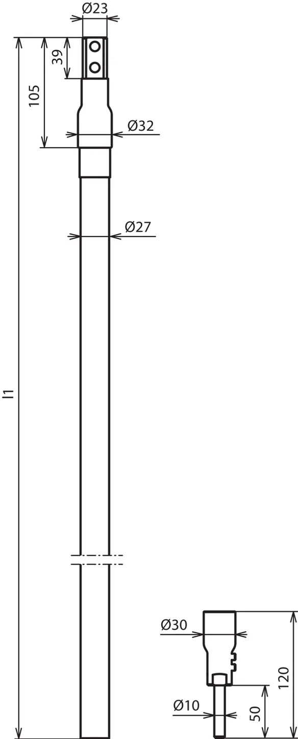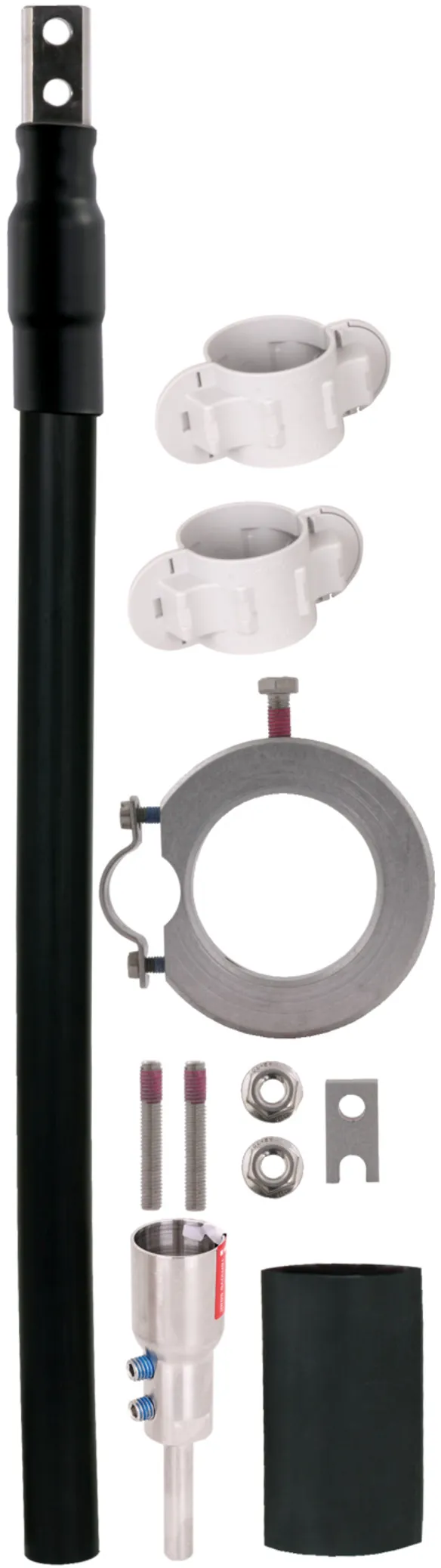 Tilslutningssæt til montering af HVI-powerleder på HVI-powerstøtterør GFK / Al består af gevindstifter, tilslutningsdel, krympeslange og befæstigelsesring med en slidset lederholder (Ø27 mm) til endeafslutningen (inklusiv kabelbindere).