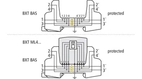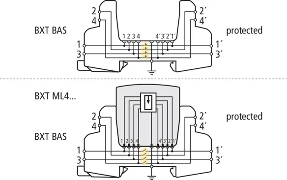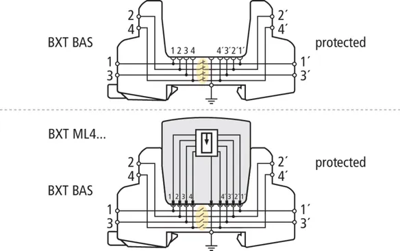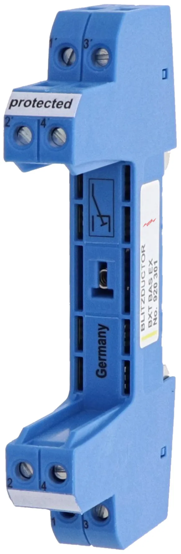 BLITZDUCTOR XT-basisdel er en særdeles pladsbesparende, universel og 4-polet gennemgangsklemme til egensikre kredse til isætning af beskyttelsesmodul. Signalet afbrydes ikke, selvom beskyttelsesmodulet fjernes. Jordforbindelsen sikres over montagefoden, som klikkes på DIN-skinnen. Da der ikke sidder beskyttelseskomponenter i basisdelen, skal kun beskyttelsesmodulet efterses og vedligeholdes.
