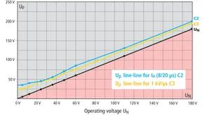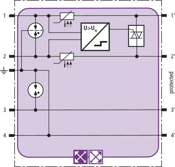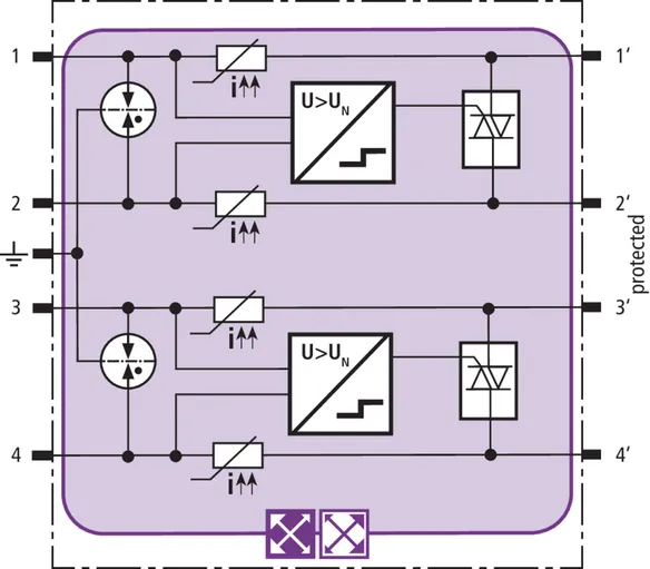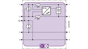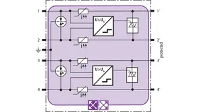 Pladsbesparende kombiafledermodul med actiVsense-teknologi og RFID-LifeCheck til beskyttelse af to lederpar med samme eller forskellige driftsspændinger i balancerede snitflader med galvanisk adskillelse. Nyttesignalets driftsspænding opfanges automatisk, og beskyttelsen optimeres herefter.