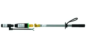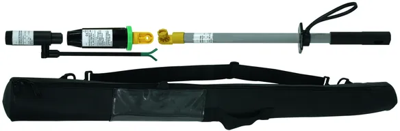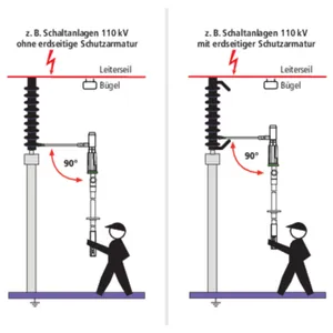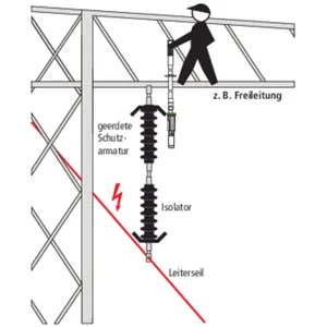 Den berøringsløse spændingstester ASP med E-feltsensor i kategori "L" er udstyret med grøn ring til kontakt med sidste jordede koronaring, så E-feltsensoren peger i retning af luftledningen for enden af isolatoren.