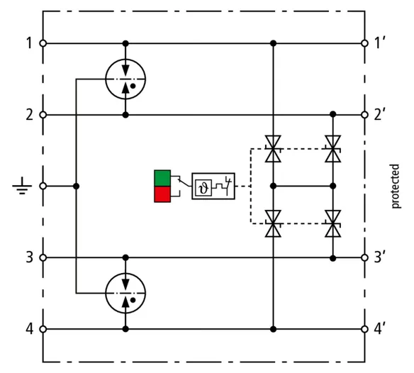 Pladsbesparende, kompakt overspændingsafleder med en bredde på 6 mm og push-in tilslutningsteknik med statusvisning. Finbegrænsende, et-trins overspændingsbeskyttelse med højtydende dioder til beskyttelse af 2 individuelle ledere med et fælles referencepotentiale og asymmetriske grænseflader.