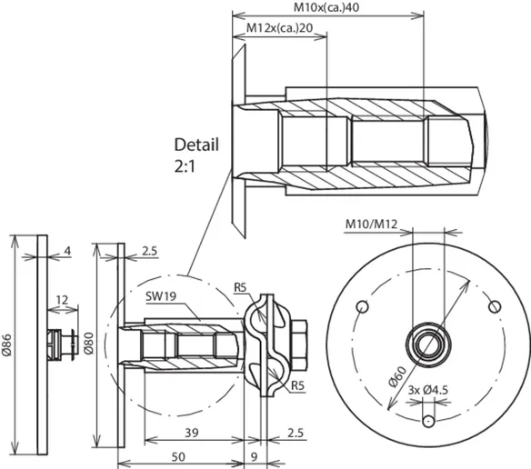 For tilslutning til bygningsarmering, tilslutningssted for nedleder til jordingsanlæg, samtidig også målepunkt (gennemgangs-/modstandsmåling).Ved tilslutningsmulighederne M10 og M12 gælder følgende minimumslængde for skruerne:M10: 35 mm (gevindlængde 40 mm)M12: 15 mm (gevindlængde 20 mm)