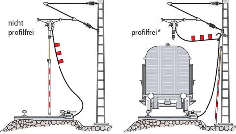 | *) Jording fri af profil betyder, at jordingskablet kan hænges på siden af masten, hvorved begrænset færdsel med diesellokomotiv er mulig. | |